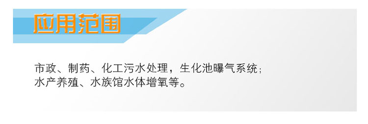 應用范圍:市政、制藥、化工污水處理,生化池曝氣系統(tǒng);水產養(yǎng)殖、水族館水體增氧等。