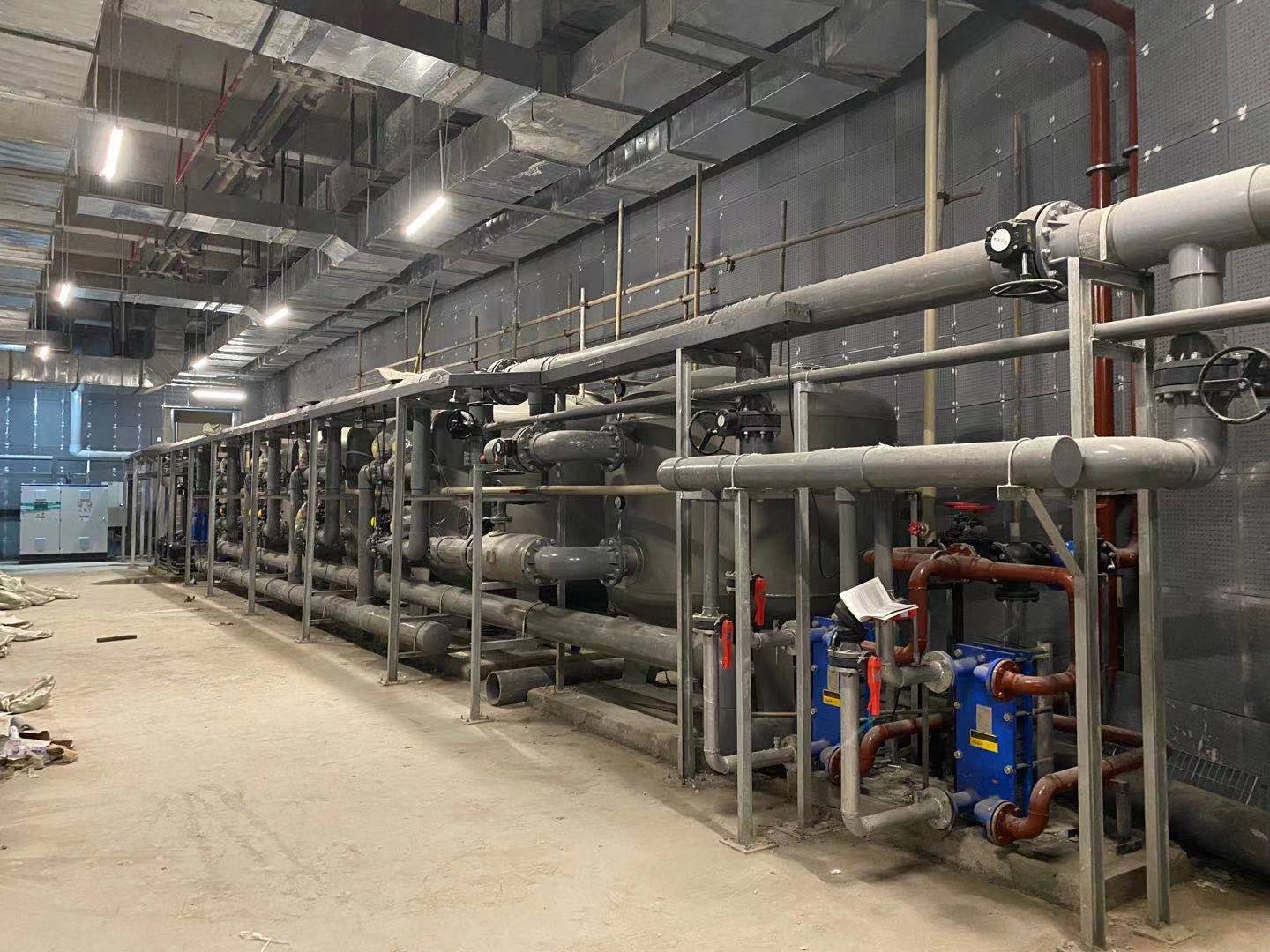 反應(yīng)罐的容積按下式確定: 反應(yīng)罐容積(m3)= 循環(huán)水流量(m3/h)× 旁流水百分比(%)× 反應(yīng)時(shí)間(h)。 在游泳池水溫度范圍內(nèi),池水中溶解的飽和濃度遵循亨利定律,臭氧發(fā)生器產(chǎn)氣中臭氧濃度越高,水中飽和濃度也越高,溶解臭氧的傳質(zhì)平衡濃度也越高,消毒性能越好。在選擇臭氧發(fā)生器時(shí)應(yīng)考慮到這一點(diǎn)。 五、工程方案設(shè)計(jì) 根據(jù)貴公司提供數(shù)據(jù)臭氧消毒用于游泳池凈化循環(huán)水系統(tǒng),整個(gè)系統(tǒng)有毛發(fā)收集器、活性炭砂缸、石英砂砂缸、加氯投藥泵等工藝輔助消毒,推薦貴司投加臭氧濃度為0.5mg/l,